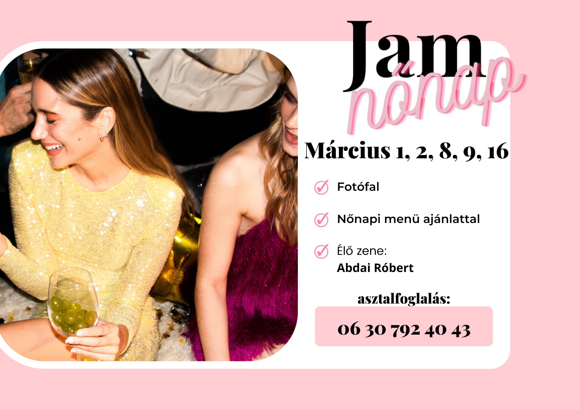 Ünnepelj együtt barátnőiddel, kolléganőiddel, családod hölgy tagjaival a Jamben, ahol élőzenével várunk mindenkit pénteken és szombaton is.